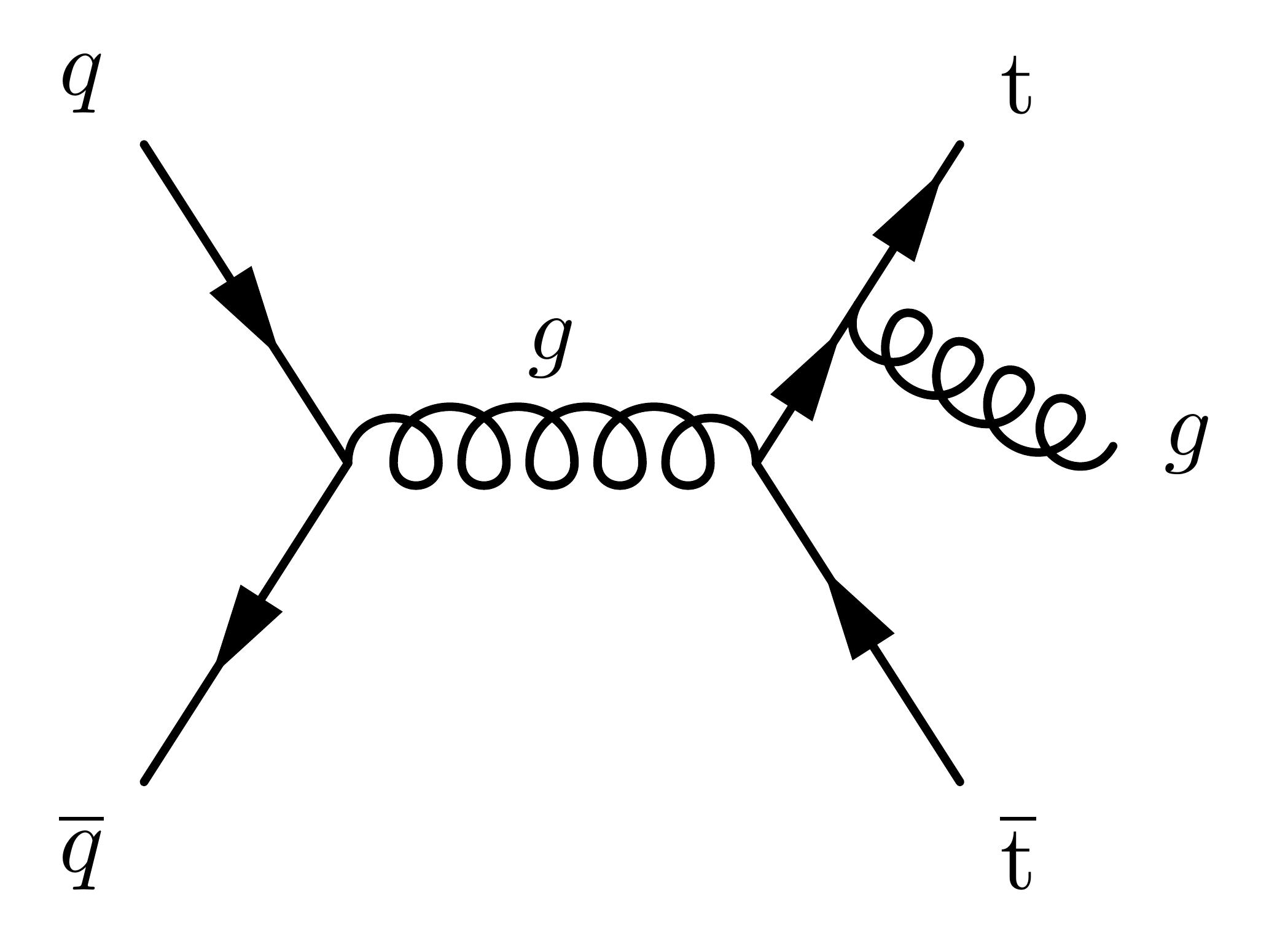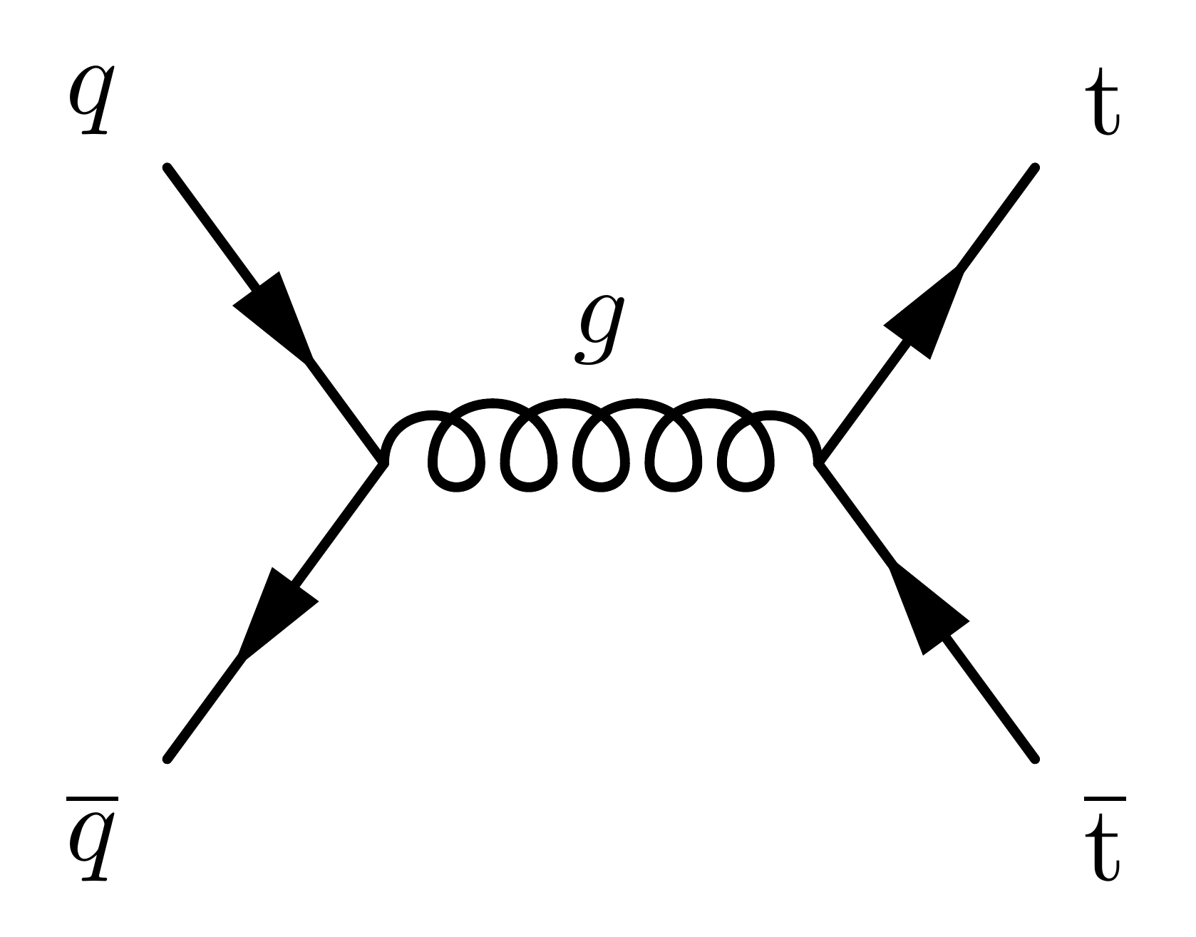 \documentclass[11pt,border=4pt]{standalone} \usepackage{feynmp-auto} \begin{document} \begin{fmffile}{feyngraph} \fmfframe(-8,18)(-5,16){ % padding (L,T)(R,B) \begin{fmfgraph*}(120,70) % dimensions (WH) % line style \fmfset{wiggly_len}{12} % boson wavelength \fmfset{wiggly_slope}{65} % boson slope of waves % external vertices \fmfleft{i2,i1} \fmfright{o2,o1} \fmftop{t} \fmfshift{5 up}{t} % skeleton \fmf{phantom}{i1,v1,i2} \fmf{phantom}{v1,v2} \fmf{phantom}{o1,v2,o2} \fmffreeze % main \fmf{fermion}{i1,g} \fmf{plain,tension=2.8}{g,v1} \fmf{fermion}{v1,i2} \fmf{gluon,tension=0}{t,g} \fmf{gluon}{v1,v2} \fmf{fermion}{o2,v2,o1} % labels \fmflabel{$q$}{i1} \fmflabel{$\overline{q}$}{i2} \fmfv{l.d=5,l.a=25,l=$g$}{t} \fmflabel{$\mathrm{t}$}{o1} \fmflabel{$\bar{\mathrm{t}}$}{o2} \end{fmfgraph*} } % close \fmfframe \end{fmffile} \end{document}