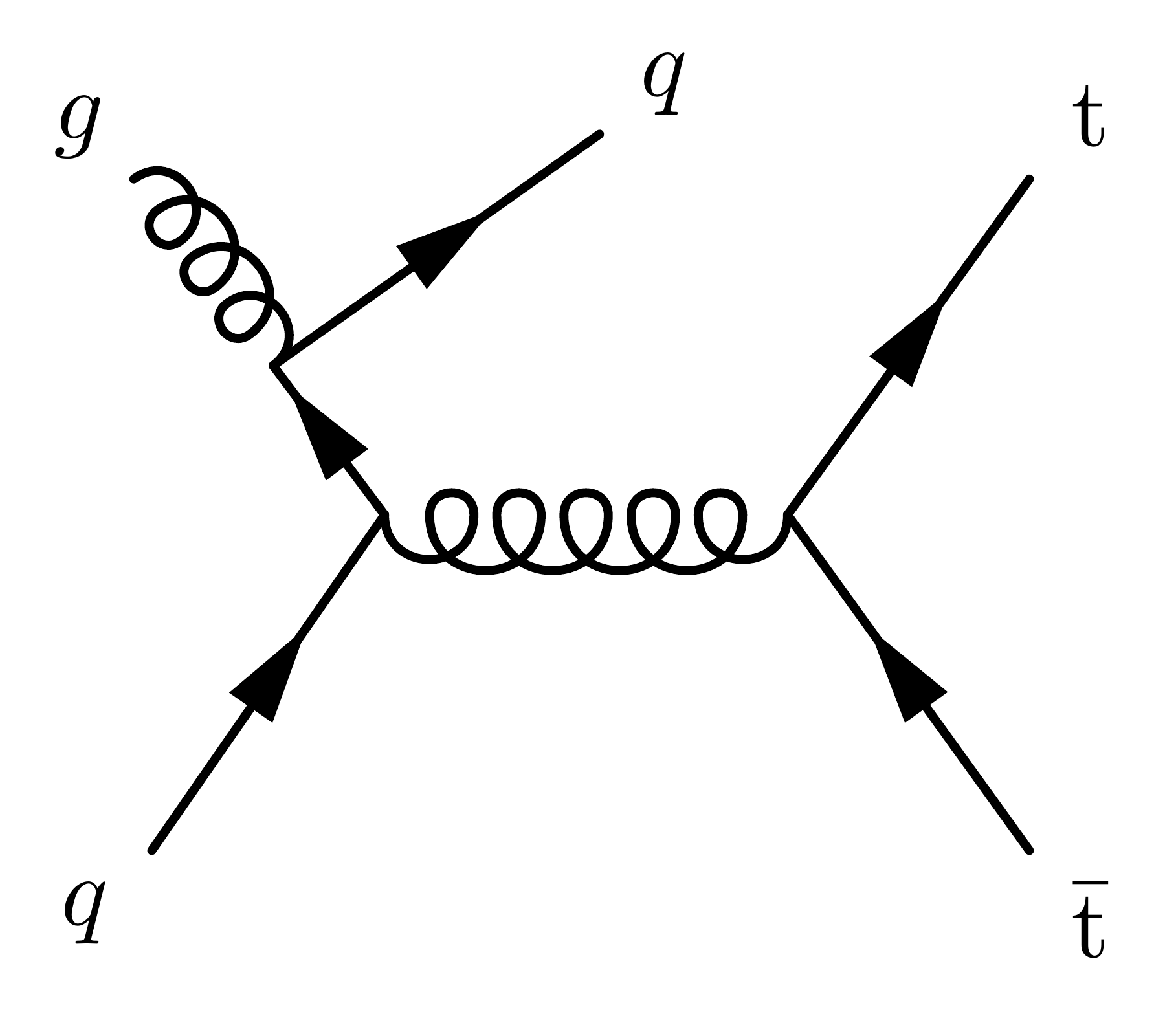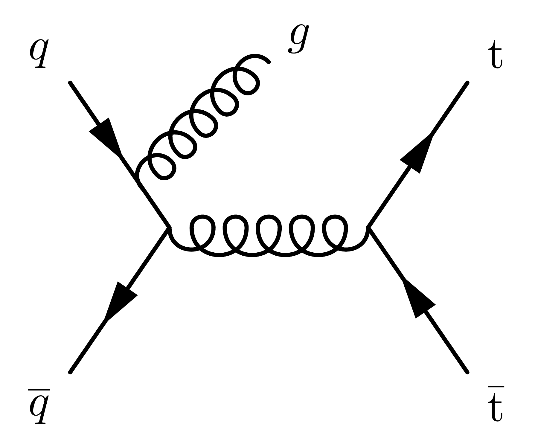 \documentclass[11pt,border=4pt]{standalone} \usepackage{feynmp-auto} \begin{document} \begin{fmffile}{feyngraph} \fmfframe(-8,15)(15,18){ % padding (L,T)(R,B) \begin{fmfgraph*}(120,75) % dimensions (WH) % line style \fmfset{wiggly_len}{12} % boson wavelength \fmfset{wiggly_slope}{65} % boson slope of waves % external vertices \fmfleft{i2,i1} \fmfright{o2,o,o1} \fmfshift{2 up}{o} \fmfshift{6 right}{o} % main \fmf{fermion}{i1,v1,i2} \fmf{gluon,label=$g$,label.side=right,label.dist=10}{v2,v1} \fmf{phantom}{o2,v2,o1} \fmffreeze \fmf{fermion}{o2,v2,v,o1} \fmf{gluon,t=0}{v,o} % labels \fmflabel{$q$}{i1} \fmflabel{$\overline{q}$}{i2} \fmflabel{$\overline{\mathrm{t}}$}{o2} \fmflabel{t}{o1} \fmflabel{$g$}{o} %\fmfv{decor.shape=circle,decor.filled=full,decor.size=3.5,f=(.7,,.1,,.1)}{v} \end{fmfgraph*} } % close \fmfframe \end{fmffile} \end{document}