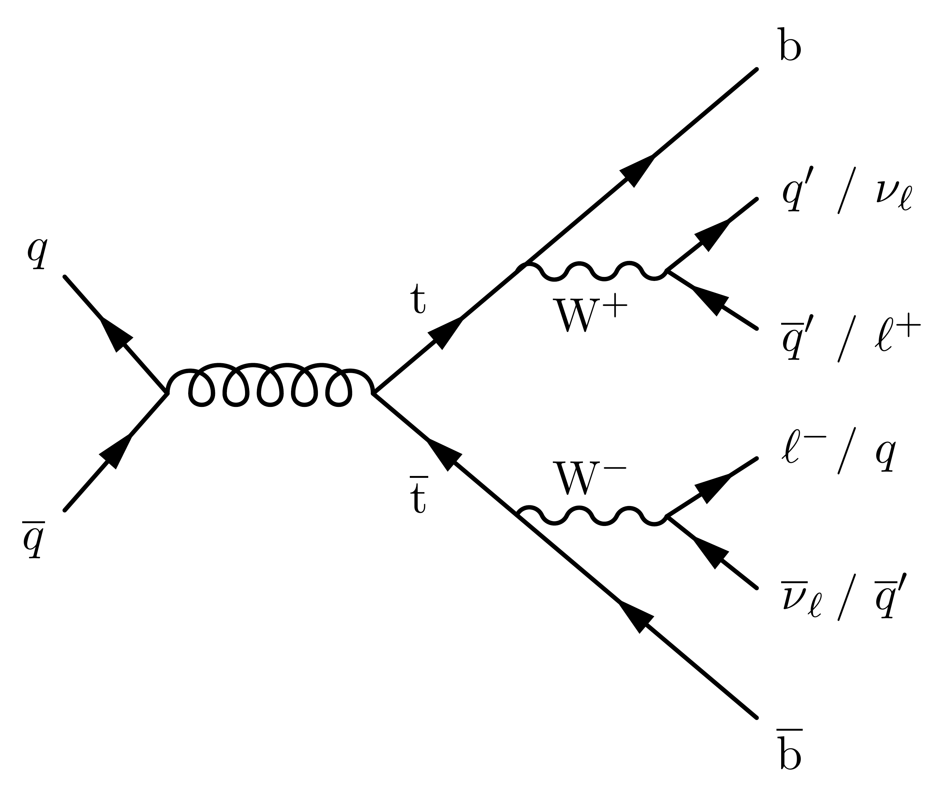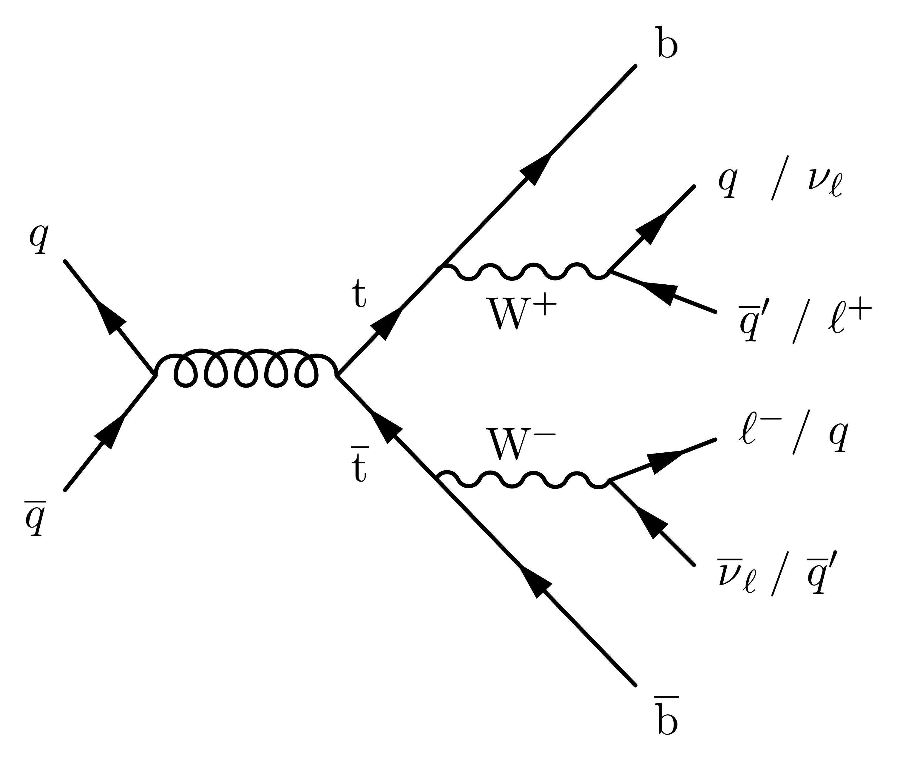 \documentclass[11pt,border=4pt]{standalone} \usepackage{feynmp-auto} \begin{document} \begin{fmffile}{feyngraph} \fmfframe(1,14)(34,16){ % padding (L,T)(R,B) \begin{fmfgraph*}(160,150) % dimensions (WH) % line style \fmfset{wiggly_len}{12} % boson wavelength \fmfset{wiggly_slope}{65} % boson slope of waves \fmfset{arrow_len}{3.6mm} % external vertices \fmfleft{d,i2,i1,d} % add dummies 'd' for spacing \fmfright{o6,o5,o4,o3,o2,o1} \fmfshift{2 up}{i1} \fmfshift{2 down}{i2} \fmfshift{4 left}{o1,o6} % shift b quarks left % qq -> g \fmf{fermion,t=1.1}{i2,vg,i1} \fmf{gluon,t=1.1}{vtt,vg} % gluon s-channel % ttbar \fmf{fermion,l.s=left,label={$\mathrm{t}$}}{vtt,v1} \fmf{fermion,l.s=left,label={$\overline{\mathrm{t}}$}}{v2,vtt} % bbbar \fmf{fermion,t=0.5}{v1,o1} \fmf{fermion,t=0.5}{o6,v2} \fmffreeze % W -> qq / lnu \fmf{boson,t=1.1,label=W$^+$,l.d=5,l.s=right}{v1,w1} % W boson \fmf{boson,t=1.1,label=W$^-$,l.d=5,l.s=left}{v2,w2} % W boson \fmf{fermion,t=1}{o3,w1,o2} % W decay \fmf{fermion,t=1}{o5,w2,o4} % W decay \fmf{phantom,t=0.2}{w1,w2} % pull decay vertices together %\fmf{phantom,t=0.05}{w1,o2,o5,w2} % pull decay vertices to the right % labels \fmfv{l.a=155,l.d=4,l=$q$}{i1} \fmfv{l.a=-155,l.d=5,l=$\overline{q}$}{i2} \fmfv{l.a=25,l.d=5,l=b}{o1} \fmfv{l.a=-25,l.d=5,l=$\overline{\mathrm{b}}$}{o6} \fmfv{l.a=20,l.d=6,l=\makebox[3.1mm][l]{$q$} / $\nu_\ell$}{o2} \fmfv{l.a=-20,l.d=6,l=\makebox[3.1mm][l]{$\overline{q}'$} / $\ell^+$}{o3} \fmfv{l.a=20,l.d=6,l=\makebox[3.1mm][l]{$\ell^-$} / $q$}{o4} \fmfv{l.a=-20,l.d=6,l=\makebox[3.1mm][l]{$\overline{\nu}_\ell$} / $\overline{q}'$}{o5} \end{fmfgraph*} } % close \fmfframe \end{fmffile} \end{document}