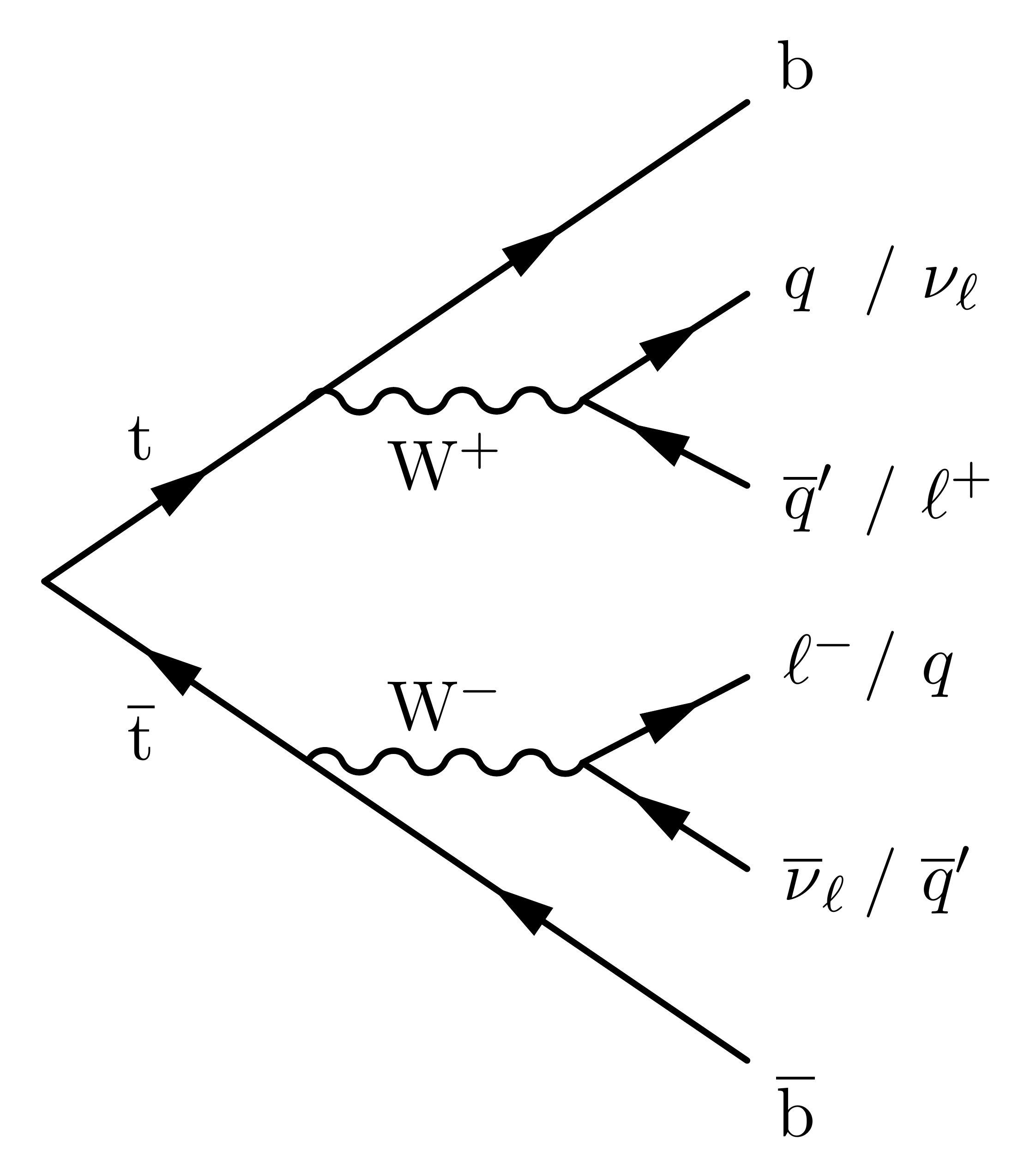 \documentclass[11pt,border=4pt]{standalone} \usepackage{feynmp-auto} \begin{document} \begin{fmffile}{feyngraph} \fmfframe(-6,14)(34,16){ % padding (L,T)(R,B) \begin{fmfgraph*}(110,150) % dimensions (WH) % line style \fmfset{wiggly_len}{12} % boson wavelength \fmfset{wiggly_slope}{65} % boson slope of waves \fmfset{arrow_len}{3.6mm} % external vertices \fmfstraight \fmfleft{i} % add dummies 'd' for spacing \fmfright{o6,o5,o4,o3,o2,o1} \fmfshift{2 up}{i1} \fmfshift{2 down}{i2} % ttbar \fmf{fermion,l.s=left,label={$\mathrm{t}$}}{i,v1} \fmf{fermion,l.s=left,label={$\overline{\mathrm{t}}$}}{v2,i} % bbbar \fmf{fermion,t=0.6}{v1,o1} \fmf{fermion,t=0.6}{o6,v2} \fmffreeze % W -> qq / lnu \fmf{boson,t=1.2,label=W$^+$,l.d=5,l.s=right}{v1,w1} % W boson \fmf{boson,t=1.2,label=W$^-$,l.d=5,l.s=left}{v2,w2} % W boson \fmf{fermion,t=1}{o3,w1,o2} % W decay \fmf{fermion,t=1}{o5,w2,o4} % W decay \fmf{phantom,t=0.05}{w1,w2} % pull decay vertices together % labels \fmfv{l.a=25,l.d=5,l=b}{o1} \fmfv{l.a=-25,l.d=5,l=$\overline{\mathrm{b}}$}{o6} \fmfv{l.a=20,l.d=6,l=\makebox[3.1mm][l]{$q$} / $\nu_\ell$}{o2} \fmfv{l.a=-20,l.d=6,l=\makebox[3.1mm][l]{$\overline{q}'$} / $\ell^+$}{o3} \fmfv{l.a=20,l.d=6,l=\makebox[3.1mm][l]{$\ell^-$} / $q$}{o4} \fmfv{l.a=-20,l.d=6,l=\makebox[3.1mm][l]{$\overline{\nu}_\ell$} / $\overline{q}'$}{o5} \end{fmfgraph*} } % close \fmfframe \end{fmffile} \end{document}